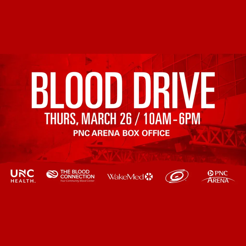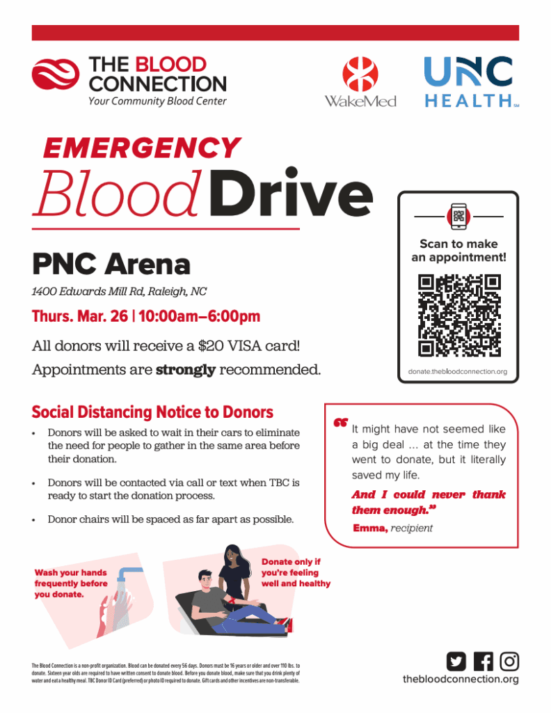 The blood drive will be next Thursday, March 26th at the PNC Arena from 10am – 6 pm.
