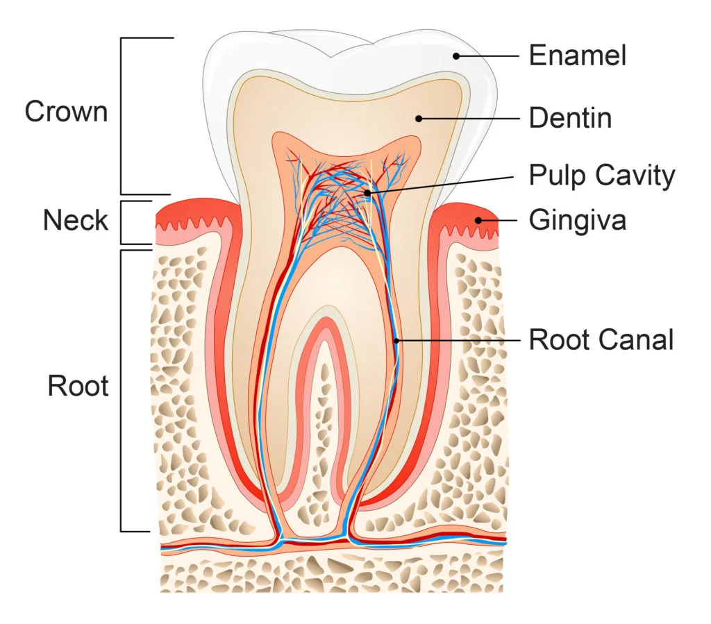 First, let’s talk about what our teeth are made of. Our teeth are composed of four main tissues: dentin, cementum, pulp, and enamel. Enamel is the outermost layer that is stronger than anything in our bodies (even our bones!) and contains minerals such as calcium phosphate. The next layer is dentin, this is the softer portion of our teeth that is susceptible to cavities. When enamel breaks down, this is where our teeth start to form cavities. Next, the inner core of your tooth is called the pulp – this is where your connective tissue and nerves lie.