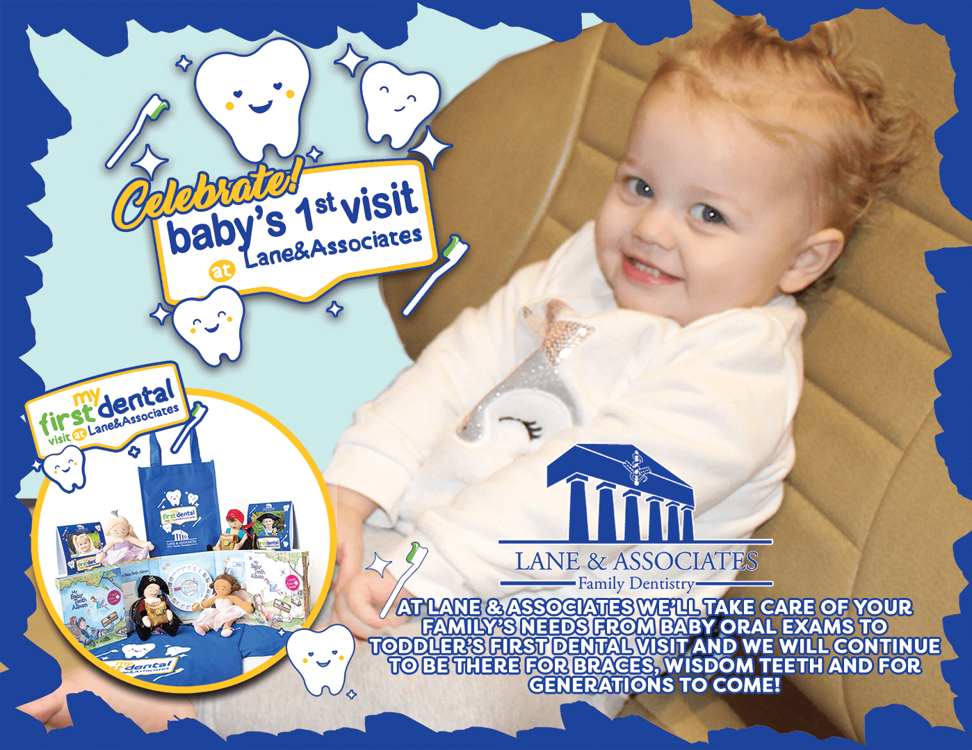 Our kid-friendly dentists will start seeing babies at 12 months old and provide a similar baby well-visit as your Pediatrician, focusing on your baby’s oral health. At Lane & Associates, our kid-friendly dentists and staff also provide a safe and comfortable environment for your child. Not to mention, our Baby First Visit kit!