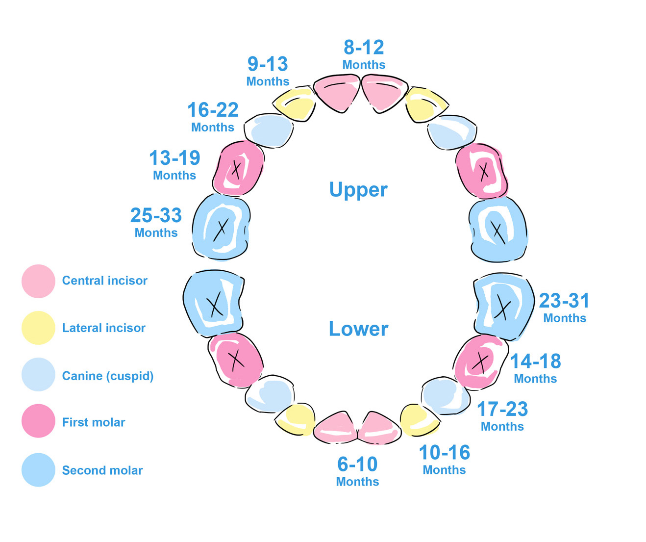 Babies are born with 20 primary teeth which are partly formed and they begin to emerge (erupt) over time. Starting with the front two teeth on the top and bottom, then working their way around the rest of the mouth. These 20 Primary teeth are typically fully formed by Age 3. Take a look at the chart to see the progression based on your child’s age.