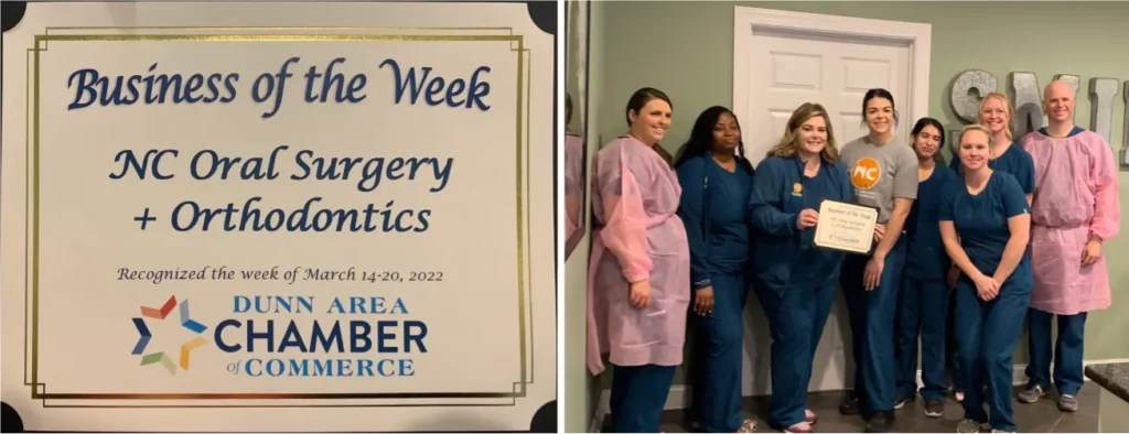 Speaking of exciting, North Carolina Oral Surgery + Orthodontics – Dunn (NCOSO) received an award. They were featured as Business of the Week by the Dunn Area Chamber of Commerce. Keep watch for Dunn Chamber announcements next Wednesday! A special shoutout to Heather with the Dunn Area Chamber of Commerce who came to the office and captured some amazing shots of the shining staff!